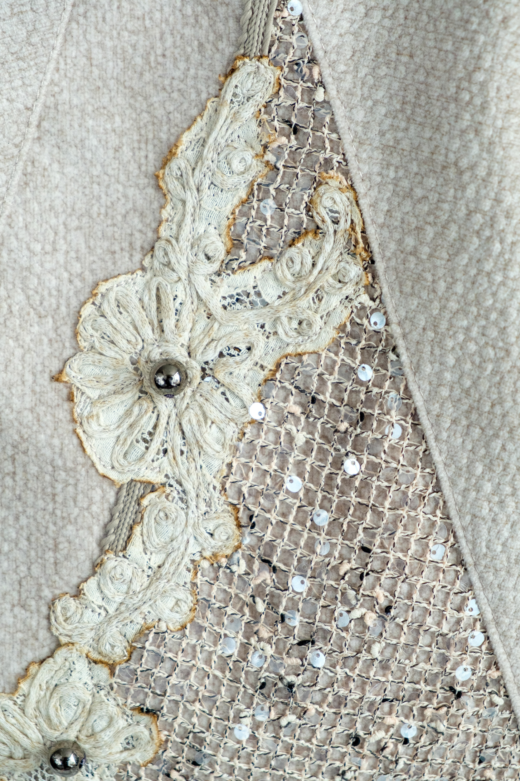 Oatmeal variant features intricate lace appliqué with metallic accents and chain strap.
