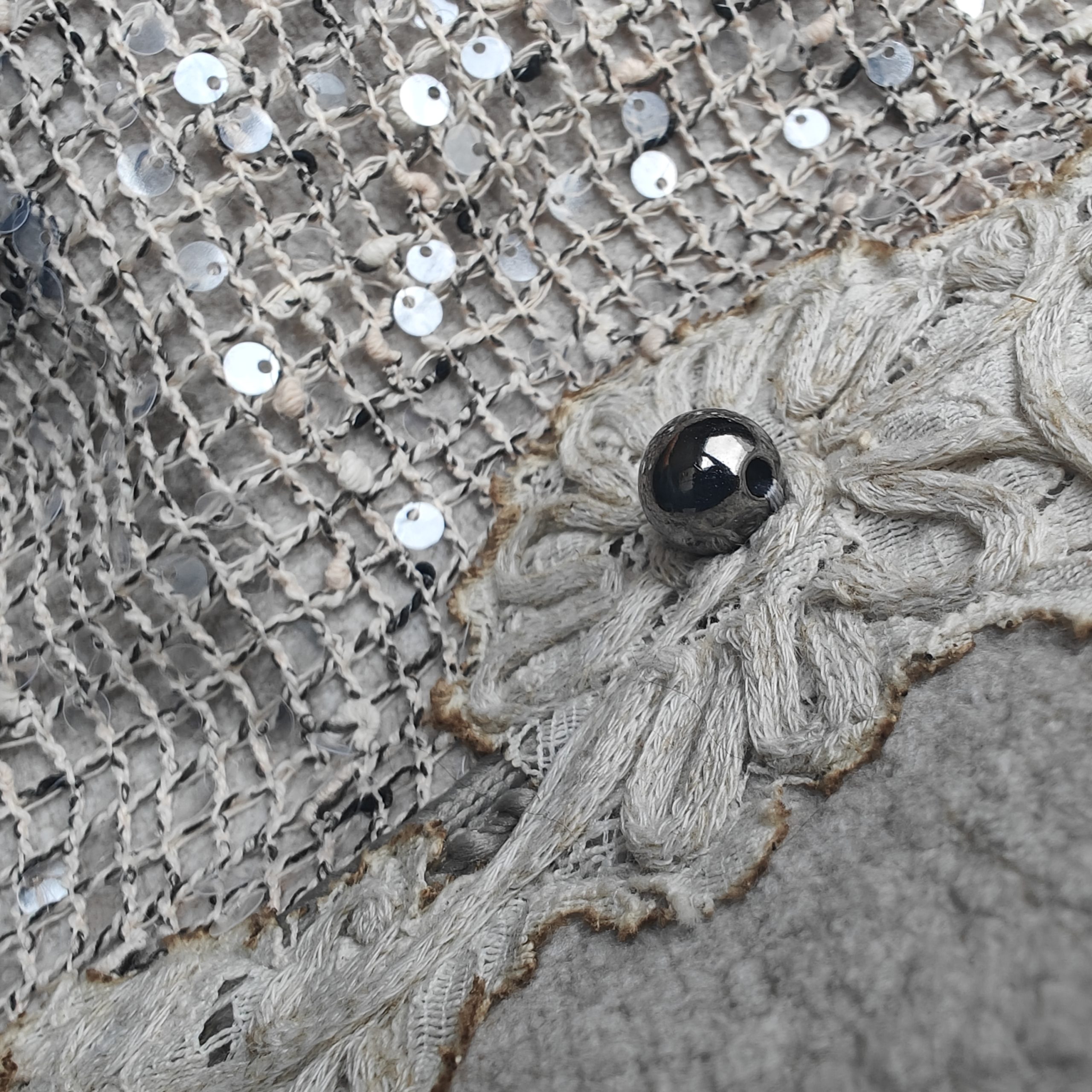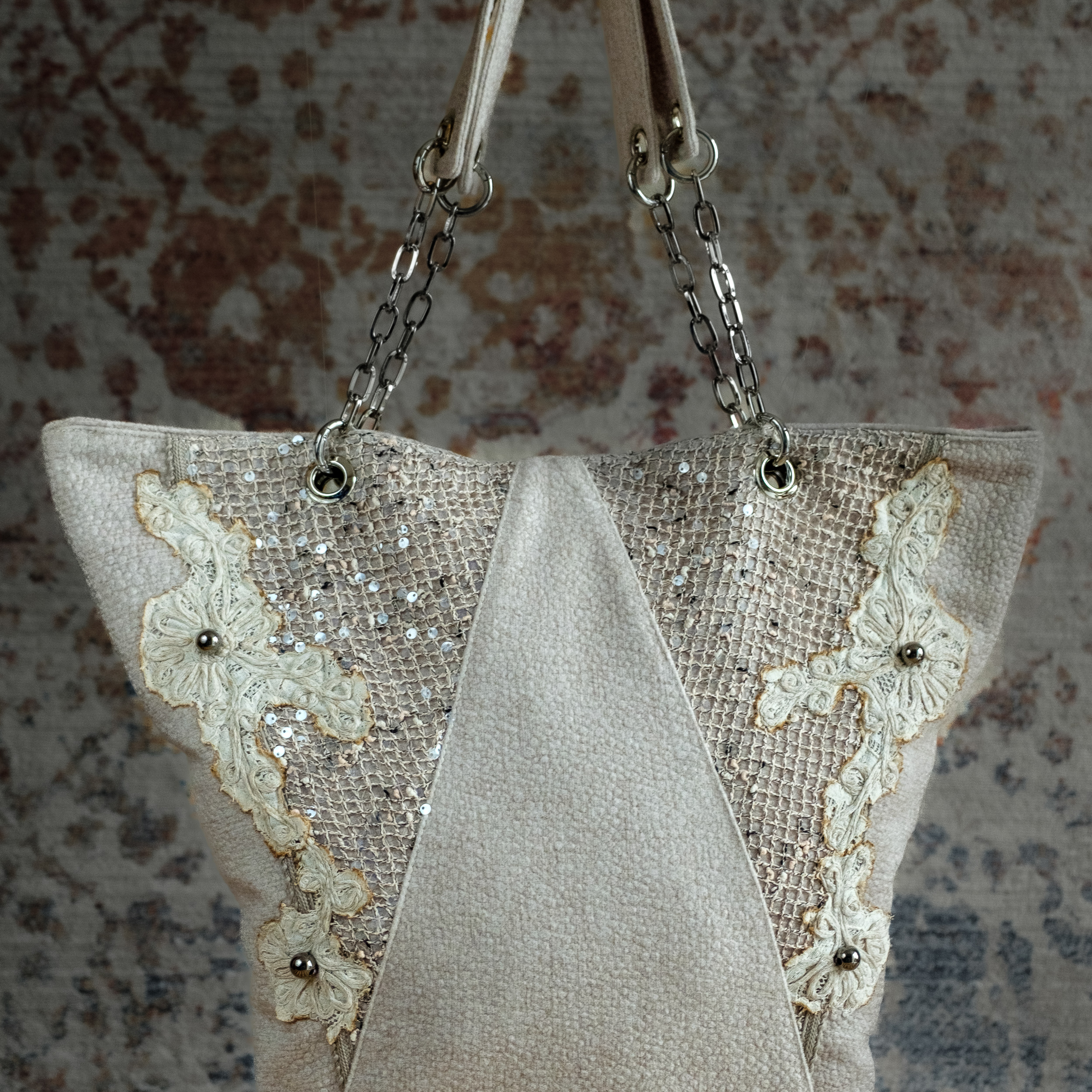 Oatmeal variant features intricate lace appliqué with metallic accents and chain strap.